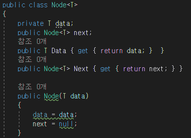 배열은 인덱스를 통해 요소들에 접근할 수 있지만 메모리상 독립적으로 위치해 있는 노드들에 접근하려면 노드들은 각자가 데이터를 가지고 다음 노드나 이전 노드에 대한 위치 정보에 대해 가지고 있어야 한다. 따라서 C#에서는 LinkedList<T> 클래스와 별개로 LinkedList<T> 클래스로부터 생성된 객체를 이루는 것은 단일 정보들의 나열이 아닌 각 노드들이다.