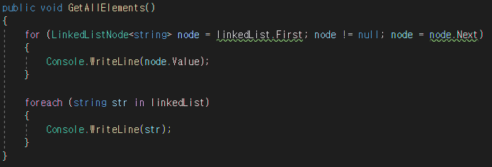 마찬가지로 링크드 리스트는 인덱스를 사용할 수 없기 때문에 0부터 시작해서 길이보다 작은 수가 될 때까지 순회하는 for문으로 요소들에 접근할 수 없다. 다만 노드를 기준으로 전과 후에 있는 요소들은 비교가 가능하기 때문에 연결 리스트의 첫번째 노드를 기준으로 시작해서 다음 노드가 null이 아닐 때까지 요소들에 접근 시킬 수 있다.