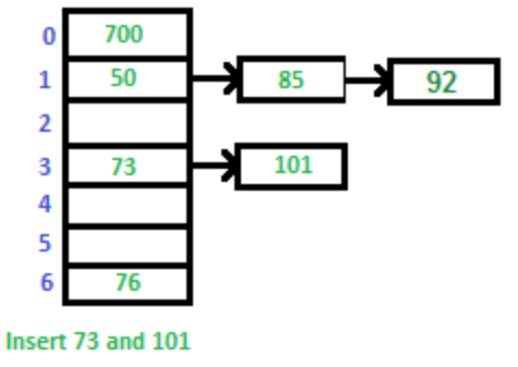 첫번째는 체이닝이다. 체이닝은 충돌이 발생했을 때 각 해시 저장 위치에 링크드 리스트와 같은 구조로 데이터를 연결하여 저장하는 방법이다. 각 해시 저장 위치는 슬롯으로 사용되고 충돌이 발생한 경우 해당 슬롯에 링크드 리스트를 구성하여 데이터를 저장한다.